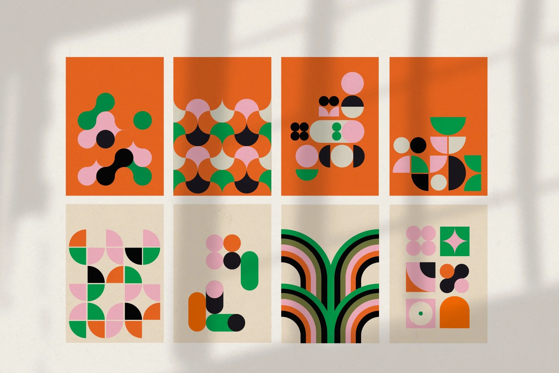 CURVY is a set of geometric shapes and posters in 2 retro color palettes. The clue is in the name with all designs using rounded, circular, curved shapes and lines.