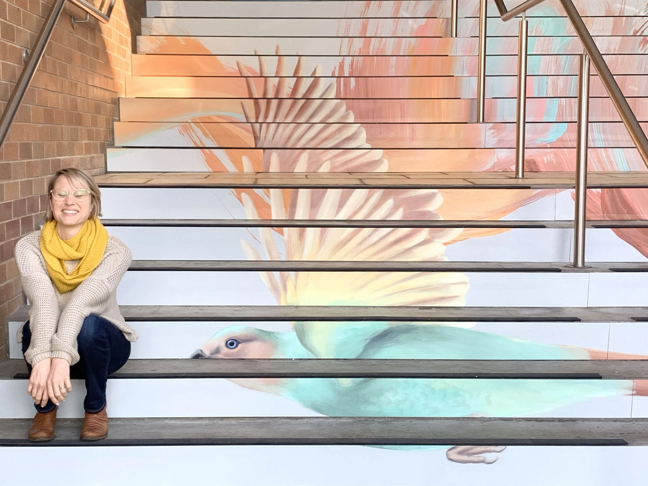 In 2020, I had a fantastic opportunity to design an 8-metre wide artwork for The Blue Mountains Cultural Centre entrance staircase. The brief was 'the artwork should enliven and enhance the urban streetscape surrounding the Cultural Centre' and my idea was to create a painting that featured a native bird to the Blue Mountains combined with expressive abstract brush strokes in a similar way to my Freedom series.